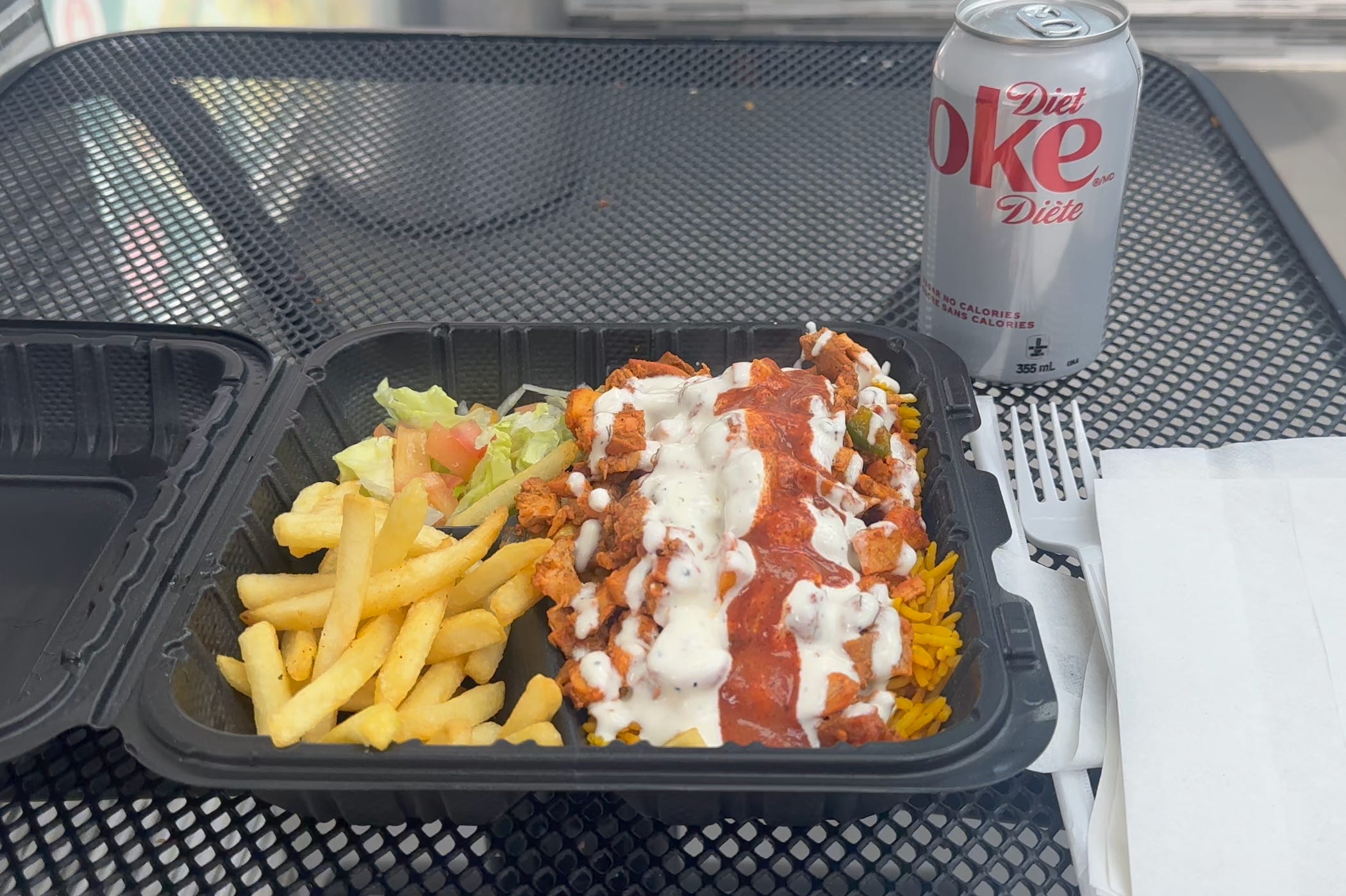 My order, which came in a black plastic clamshell container, contained a handful of fries, a tiny serving of pale iceberg and tomato that was more of a gesture than a salad and a generous portion of what was almost certainly chicken over a heap of yellow rice, slathered in white sauce and hot sauce.
