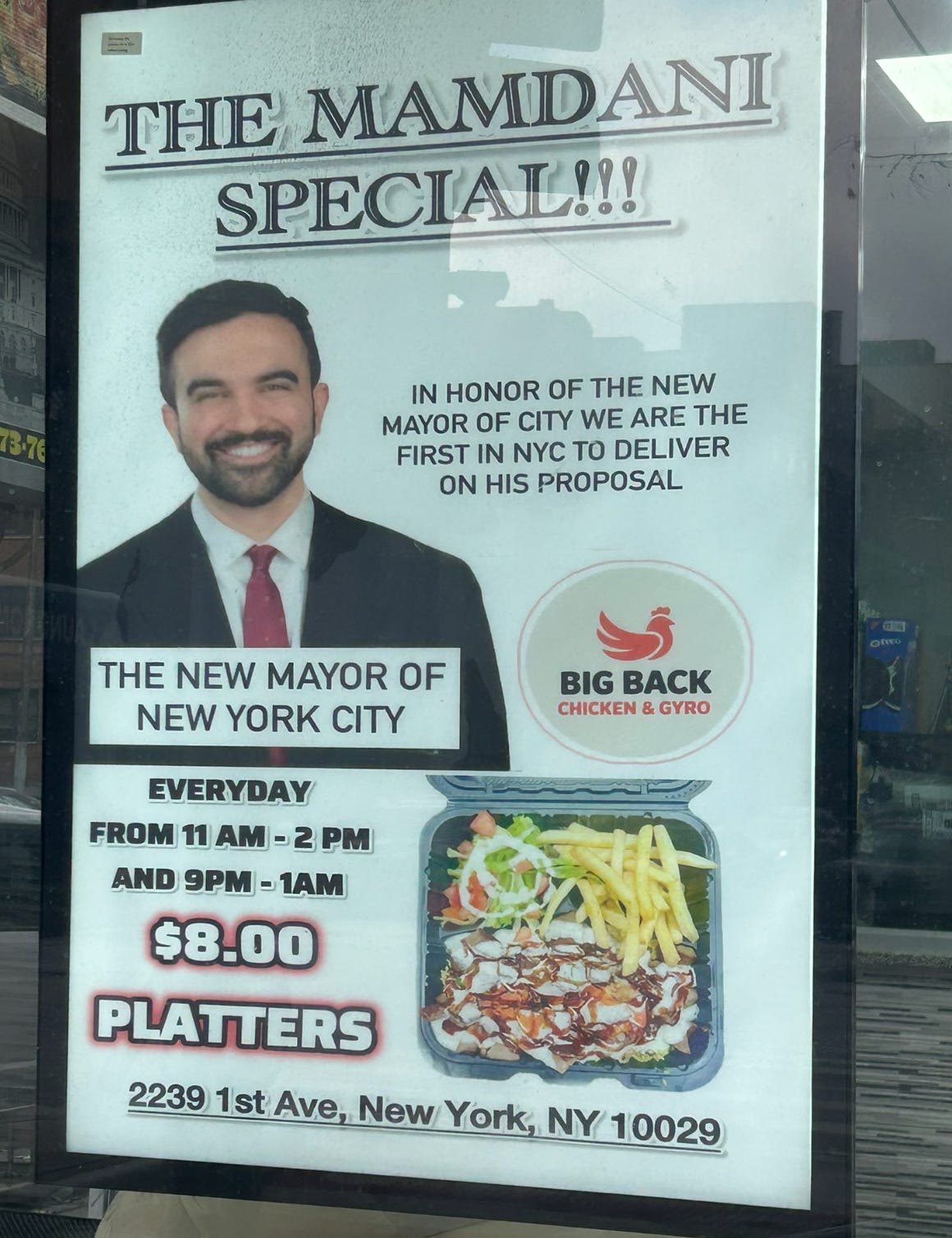 I was scrolling Twitter recently when I spotted a photo someone had posted of a promotion hanging in a NYC restaurant window. “THE MAMDANI SPECIAL!!!” It said. “$8.00 PLATTERS”.