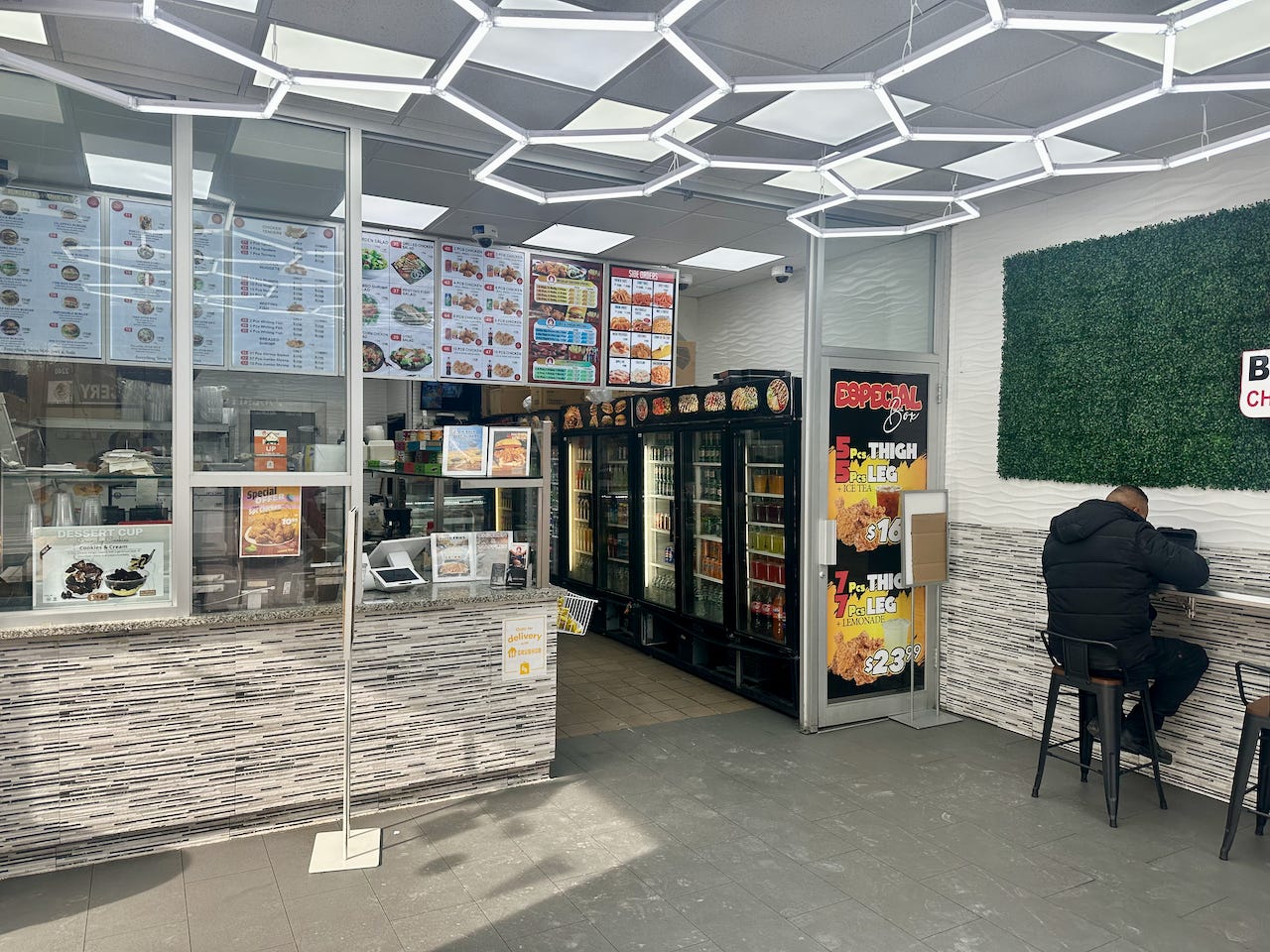 I took a seat at one of two tiny tables and looked around. The storefront featured one ATM machine, one trash can, one customer, a plastic plant wall and a somewhat groovy fluorescent light sculpture on the ceiling that looked like something rescued from an early ’80s art installation.