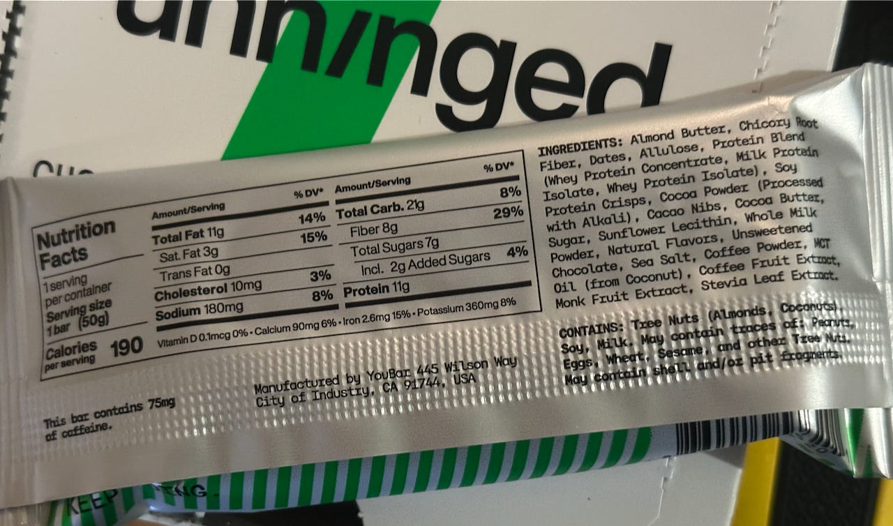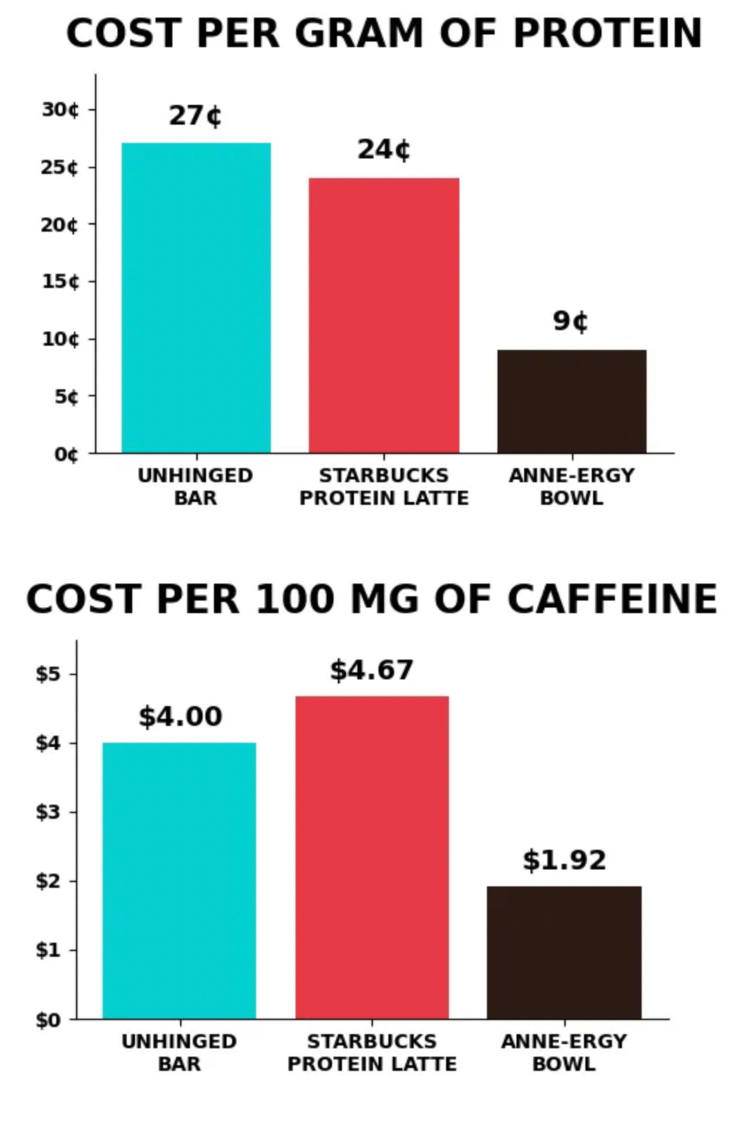 So which is the best bang for the buck? I did some Anne math to determine which is the better deal—the $3 Unhinged bar, which has 75 grams of caffeine and 11 grams of protein, or the $7 Starbucks tall protein latte, which has 150 milligrams of caffeine and 29 grams of protein.