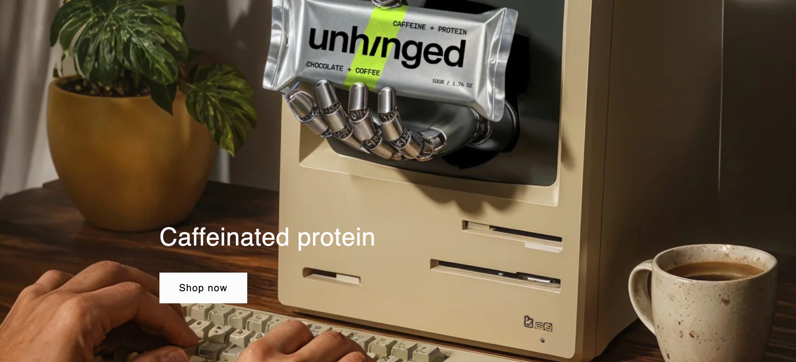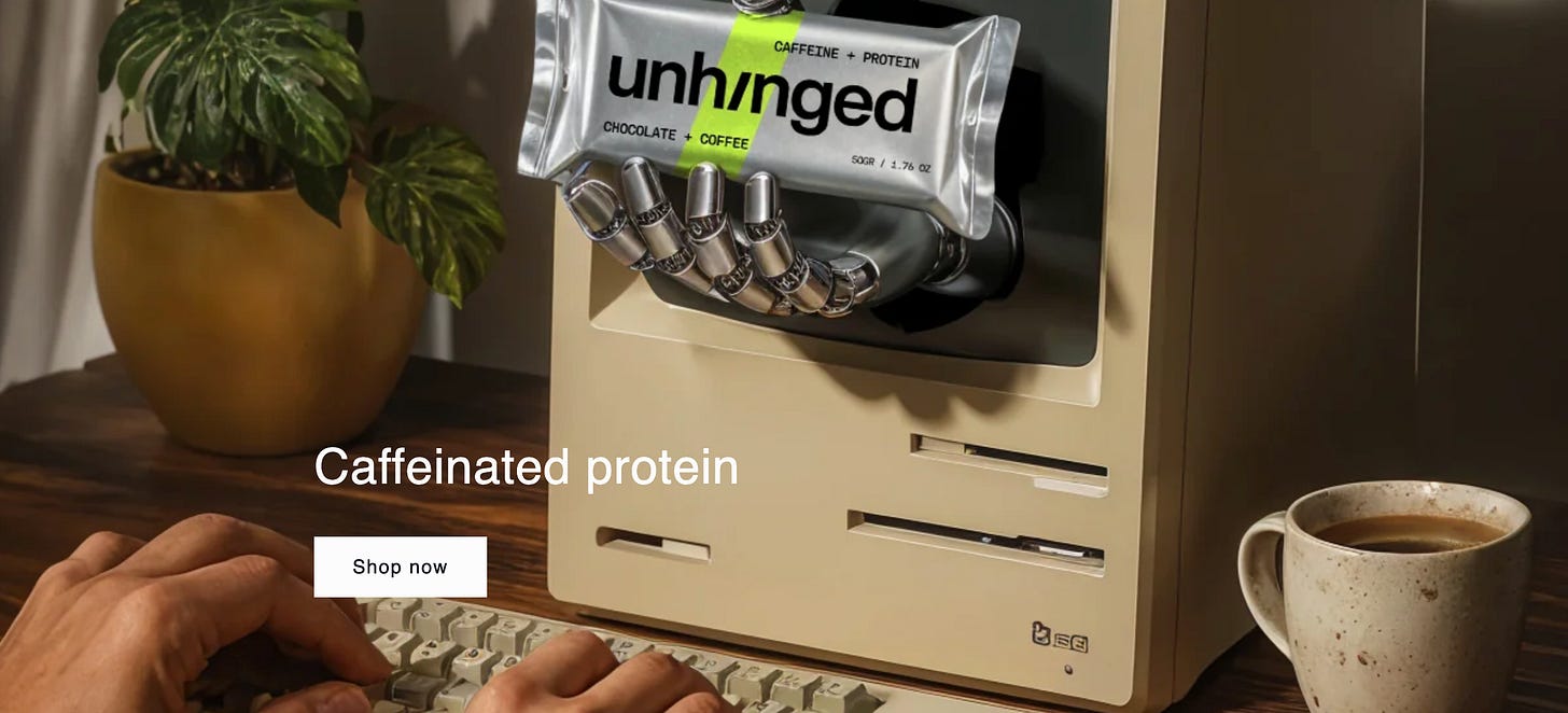 As soon as I got home that afternoon, I looked for the bars on Amazon. Nothing. Huh! But a Google search took me to the Unhinged website. It featured a photo of a robot hand emerging from the monitor of 1980s Mac, proffering a protein bar. Was this some sort of joke product?