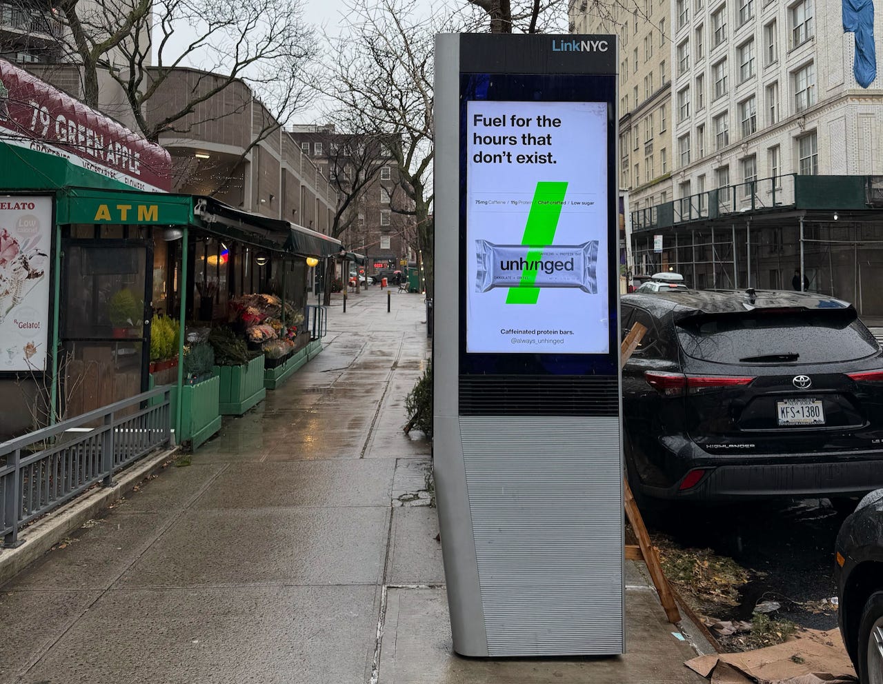 My latest adventure started last Tuesday morning when, a block from my home in Brooklyn Heights, I happened to glance at the digital billboard on one of those LinkNYC kiosks. It was advertising a new caffeinated protein bar with a peculiar name: “Unhinged”. The tagline: “Fuel for the hours that don’t exist.”